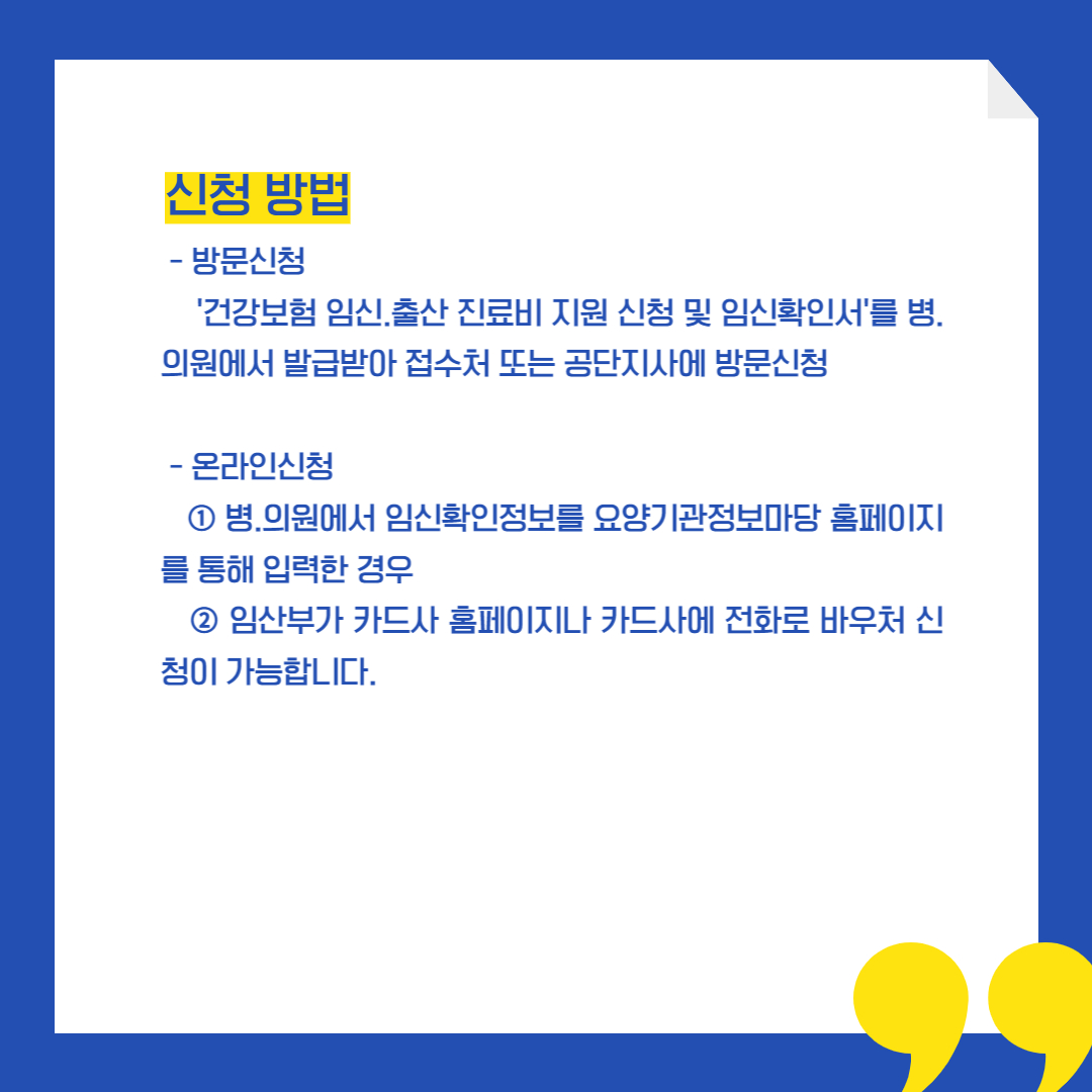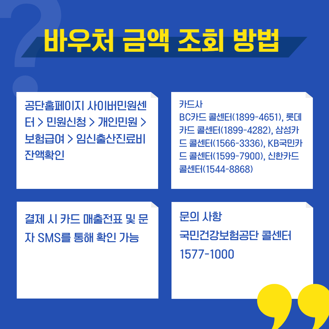 임신이 확인되면 출산 이후 까지도 사용 가능한 임신 바우처가 있습니다. 바로 임산부에게 건강한 태아의 분만과 산모의 건강관리를 위한 국민행복카드를 이용하면 됩니다.